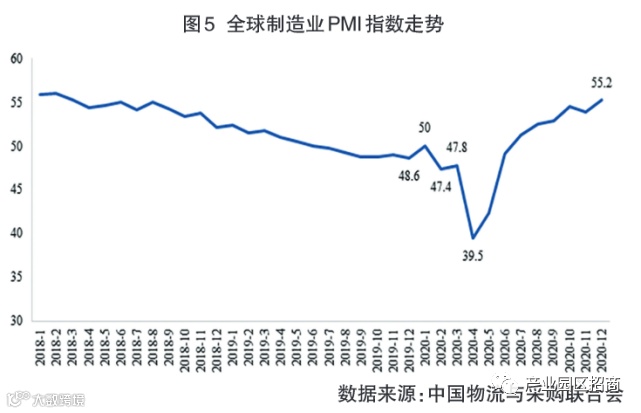 图5反映了2018年1月至2020年11月全球制造业PMI指数走势。如图5所示,2020年2月,在新冠肺炎疫情的影响下,中国制造业回落,全球制造业PMI指数也明显回落(降至47.4),全球制造业增长有所放缓。2020年3月,新冠肺炎疫情在中国得到了明显控制,对中国的影响逐步降低,全球制造业PMI指数有所回升(回升至47.8)。但是随着疫情对中国以外地区的影响程度逐步加深,2020年4月,全球制造业PMI指数出现了大幅回落(降至了39.5)。新冠肺炎疫情的全球化蔓延为全球经济发展带来了前所未有的严峻考验,全球经济面临较大的下行压力。随着各国针对防疫情、保民生、稳经济出台了诸多政策,2020年5月全球制造业PMI指数较上月有所回升,小幅回升至42.4,仍处于荣枯线以下,新冠肺炎疫情对全球经济的影响继续显现,全球制造业维持弱势格局。2020年5月至2020年10月,全球制造业呈现明显的复苏迹象,全球制造业PMI指数连续数月上升,大幅上涨至2020年10月的54.5。但是由于疫情并未得到完全有效控制,11月PMI指数小幅回落。2020年12月,全球制造业PMI指数升至全年最高(55.2),全球制造业复苏势头进一步增强。随着世界主要经济体新冠肺炎疫苗的获批上市,预计2021年世界经济形势较2020年会有较明显的好转。