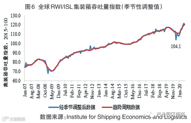 图6中全球RWI/ISL集装箱吞吐量指数表明,2020年2月RWI/ISL集装箱吞吐量指数受新冠肺炎疫情蔓延的影响,大幅回落至104.1,较上月降低了8.4。尽管大幅度回落,2020年春季全球集装箱吞吐量的降幅仍旧远远小于2008—2009年金融危机期间从高峰到低谷的降幅。这表明面对新冠肺炎疫情大流行,当前全球集装箱运输具有一定的弹性。在2020年春节的短暂回落之后,2020年5月,全球RWI/ISL集装箱吞吐量指数呈现出了稳定恢复的态势。世界贸易已经显著地从2020年春季的重大衰退中恢复过来。当前世界航运已经恢复到甚至超出了疫情之前的航运水平。