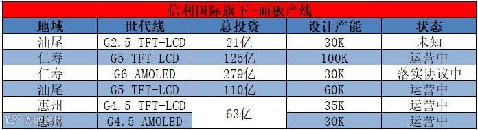 据维科网显示了解,信利国际当前共筹划、运营着6条面板产线,总投资近600亿,其中: