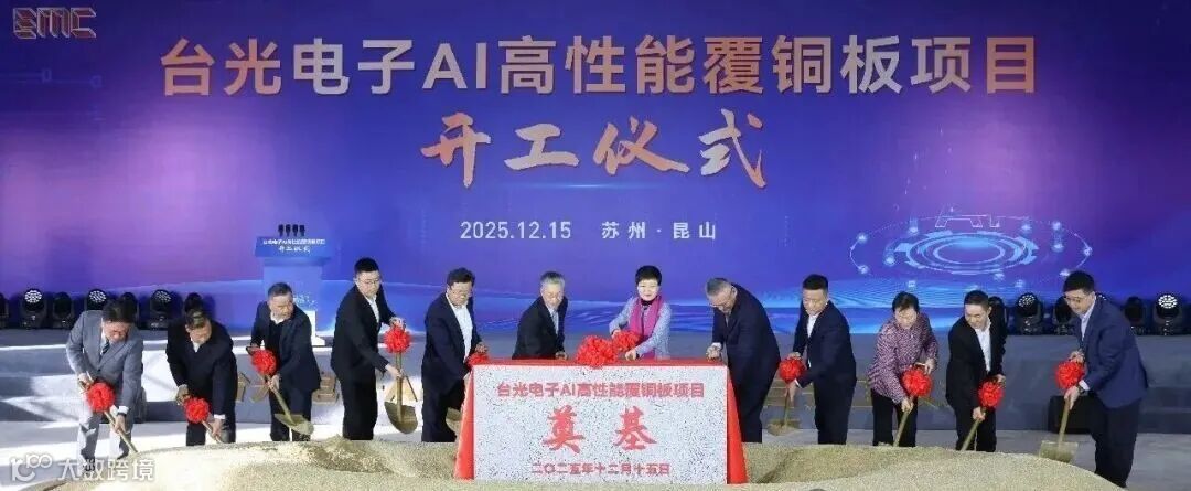 12月15日,台光电子AI高性能覆铜板项目开工仪式在江苏省昆山市周市镇举行。该项目是台光电子顺应产业趋势的重要布局,达产后将推动企业全年产值突破200亿元,同时为昆山从电子信息重镇向人工智能产业高地转型注入动力。