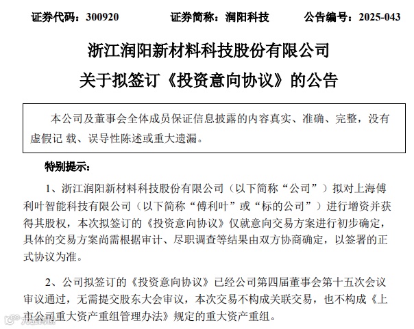 5月26日晚,润阳科技公告称,拟对上海傅利叶智能科技有限公司(以下简称“傅利叶”)进行增资并获得其股权。本次拟签订的《投资意向协议》仅就意向交易方案进行初步确定,具体的交易方案尚需根据审计、尽职调查等结果由双方协商确定,以签署的正式协议为准。