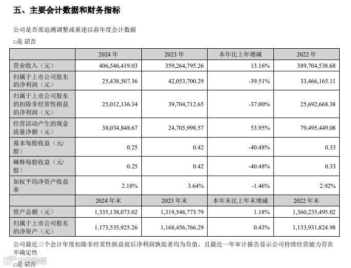 2024年,该公司实现营业总收入4.07亿元,同比增长13.16%;归母净利润为2543.85万元,同比下降39.51%;扣非归母净利润为2501.21万元,同比下降37.00%。