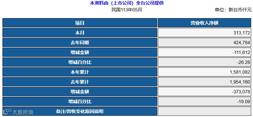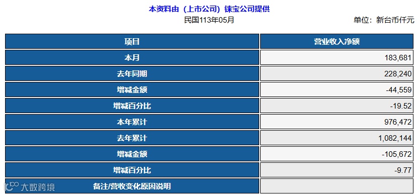 2024年5月份,铼宝科技累计实现营收1.84亿新台币,环比下降22.90%,同比下降19.52%;2024年前五个月,铼宝科技累计实现营收9.76亿新台币,同比下降9.77%。