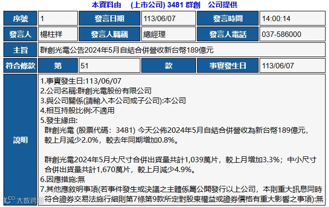 截至今(11)日,据笔者查阅台交所公告资料显示,台系七大面板厂-群创光电、友达光电、瀚宇彩晶、凌巨科技、铼宝科技、全台晶像与华凌光电已全部披露2024年5月份财报。