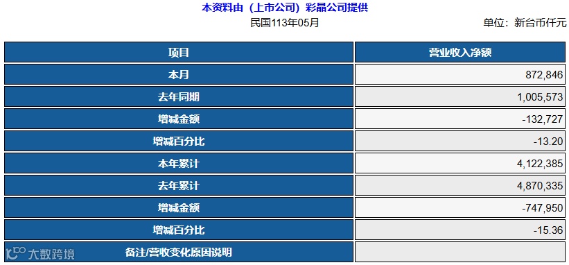 2024年5月份,瀚宇彩晶累计实现营收8.73亿新台币,环比增长22.42%,同比下降13.20%;2024年前五个月,瀚宇彩晶累计实现营收41.22亿新台币,同比下降15.36%。