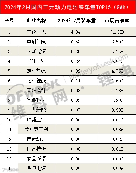再看2024年2月国内三元动力电池装车量TOP15,它们分别是:宁德时代、中创新航、LG新能源、欣旺达、蜂巢能源、亿纬锂能、国轩高科、孚能科技、正力新能、瑞浦兰钧、荣盛盟固利、捷威动力、巨湾技研、泰星能源、星恒电源。