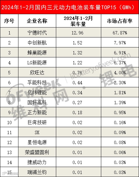 2024年1-2月国内三元动力电池装车量TOP15,它们分别是:宁德时代、中创新航、蜂巢能源、LG新能源、欣旺达、孚能科技、亿纬锂能、国轩高科、正力新能、巨湾技研、SK、星恒电源、荣盛盟固利、捷威动力、瑞浦兰钧。