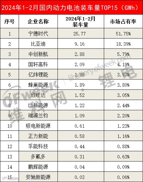 2024年1-2月国内动力电池装车量TOP15,它们分别是:宁德时代、比亚迪、中创新航、国轩高科、亿纬锂能、蜂巢能源、欣旺达、LG新能源、瑞浦兰钧、极电新能源、正力新能、孚能科技、多氟多、鹏辉能源、安驰新能源。