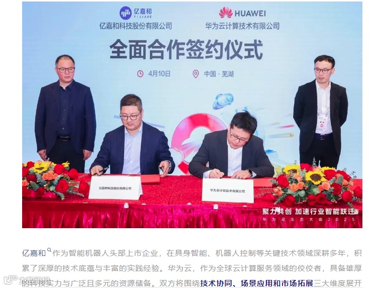 此外,4月,亿嘉和与华为云来了一场“巨头联姻”。这两位巨头将强强联合,围绕技术协同、场景应用和市场拓展三大维度,在具身智能领域开展前沿探索。