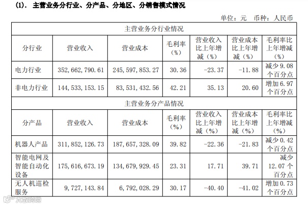 分产品表现来看,各业务线呈现显著分化态势:机器人产品营收3.12亿元,同比减少22.36%;智能电网设备营收1.75亿元,同比增长17.71%;无人机巡检服务营收972.71万元,同比下滑40.40%。