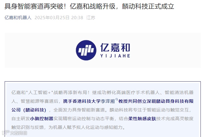 3月,亿嘉和来了场“联名”——携手“大疆教父”李泽湘教授共同创立深圳麟动具身科技有限公司(以下简称“麟动科技”)。
