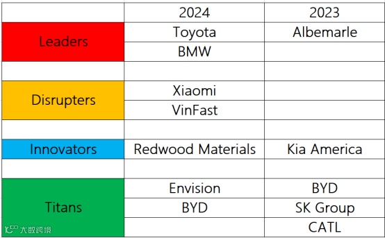 比亚迪与远景入选巨头(Titans)类别,入选该类别的其他企业包含亚马逊、空客、迪士尼、英伟达等。
