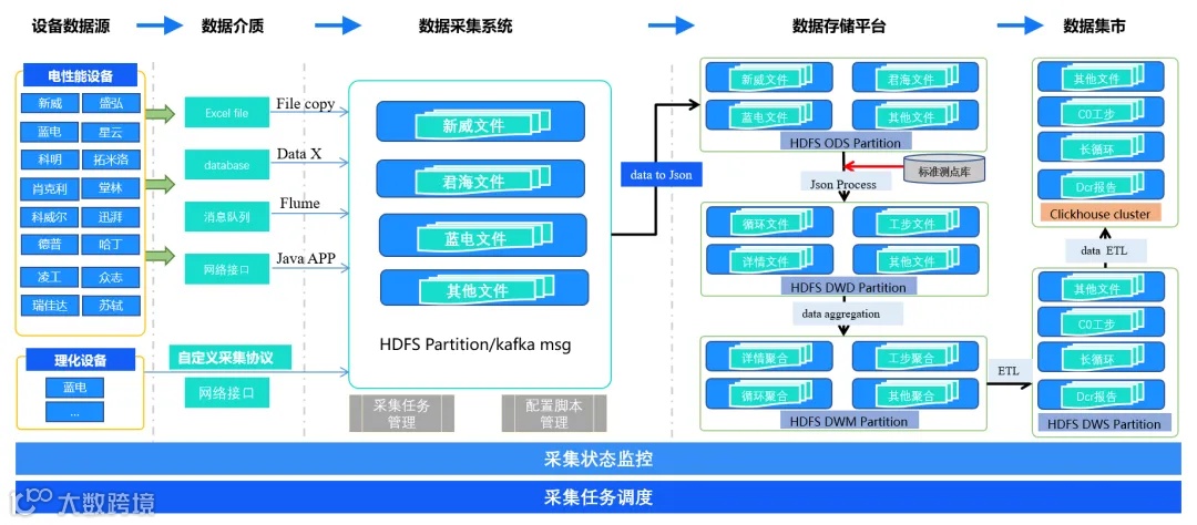 dCore(数据存储与处理平台)搭建了56个数据脚本(设备数据标准化、数据仓库处理、数据质量探查)和3个数据处理模型(预处理模型、温度通道模型、工步序号模型),以T+1的方式处理每日产生的大量数据,分布式计算解决数据清洗及分析统计,最终的少量数据进入高性能数据库Clickhouse满足业务灵活的展示需求。多维度呈现可视化信息,时刻监控测试数据及时发现异常,避免长期浪费资源!