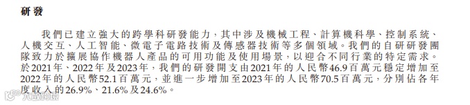 关于研发投入,越疆科技呈现出稳步增长的趋势,从2021年的4690万人民币上升至2022年的5210万人民币,再到2023年达到7050万人民币,这些数字分别占到各自年份总收入的26.9%、21.6%及24.6%,彰显了公司对技术创新的持续重视与投入。