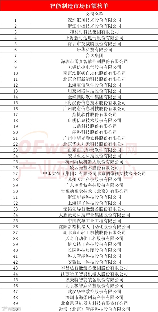 在我国智能制造大发展之际,维科产业研究中心推出2023年我国智能制造市场份额TOP50榜单,聚焦工业控制、工业软件、工业视觉和工业机器人及集成系统四大智能制造核心领域。榜单排序以企业智能制造业务营收(70%)、业务应用领域(15%)和行业知名度(15%)为评价维度进行,榜单如下: