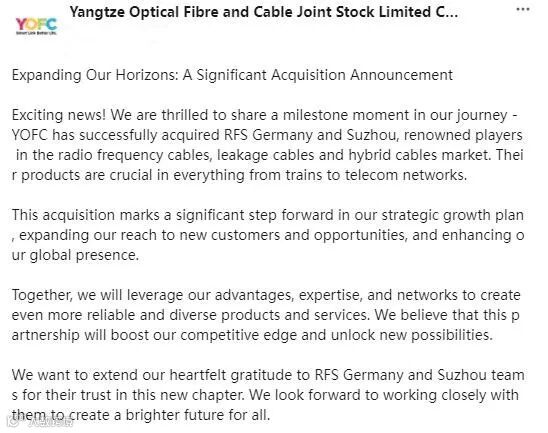 对于此次收购,长飞公司表示出极大的信心和期待:“我们很高兴在我们的旅程中分享一个里程碑的时刻——长飞公司成功收购了在射频电缆、漏缆和混合电缆市场上享有盛誉的RFS德国及RFS苏州公司。他们的产品在从轨道交通到电信网络的所有领域都至关重要。”