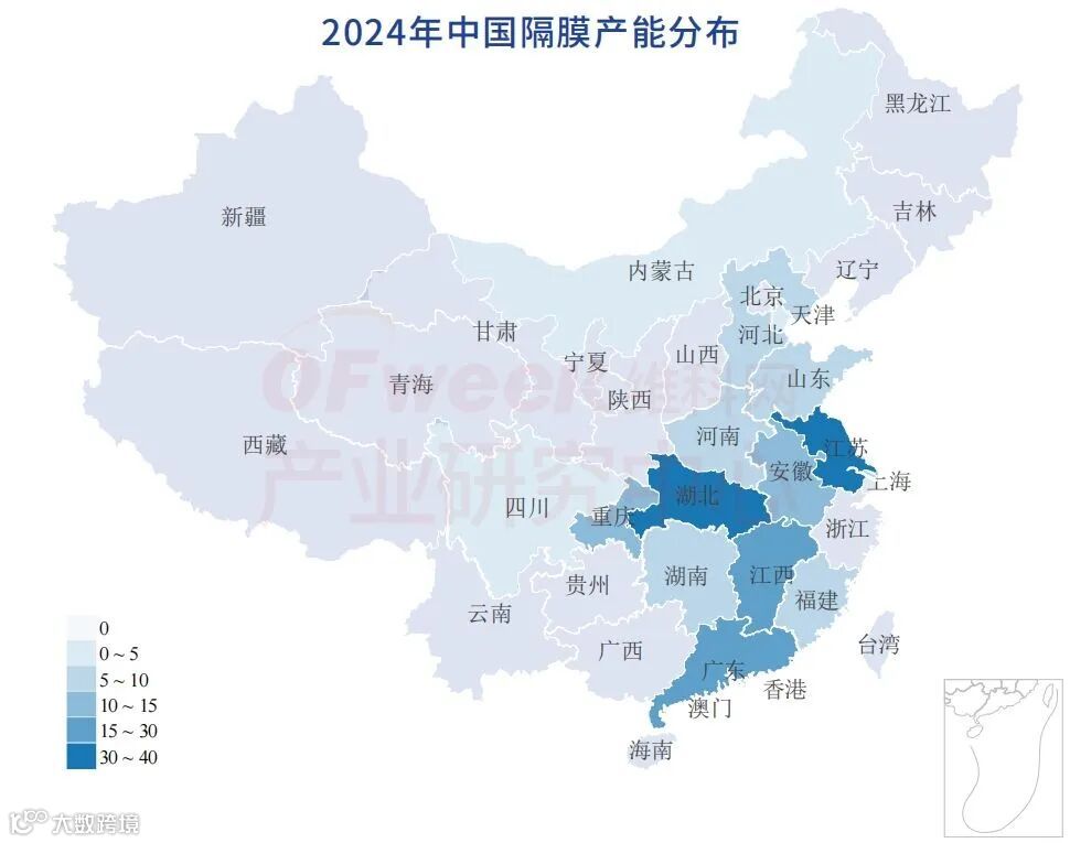 龙头厂商隔膜产能合计188.1亿平,恩捷股份以超过70亿平的产能大幅领先,星源材质、河北金力、中兴新材等其余龙头厂商的产能规模均在均在20亿平左右。湖北、江苏是目前我国重要的隔膜产区,以超过30亿平的产能规模领先其余各省。