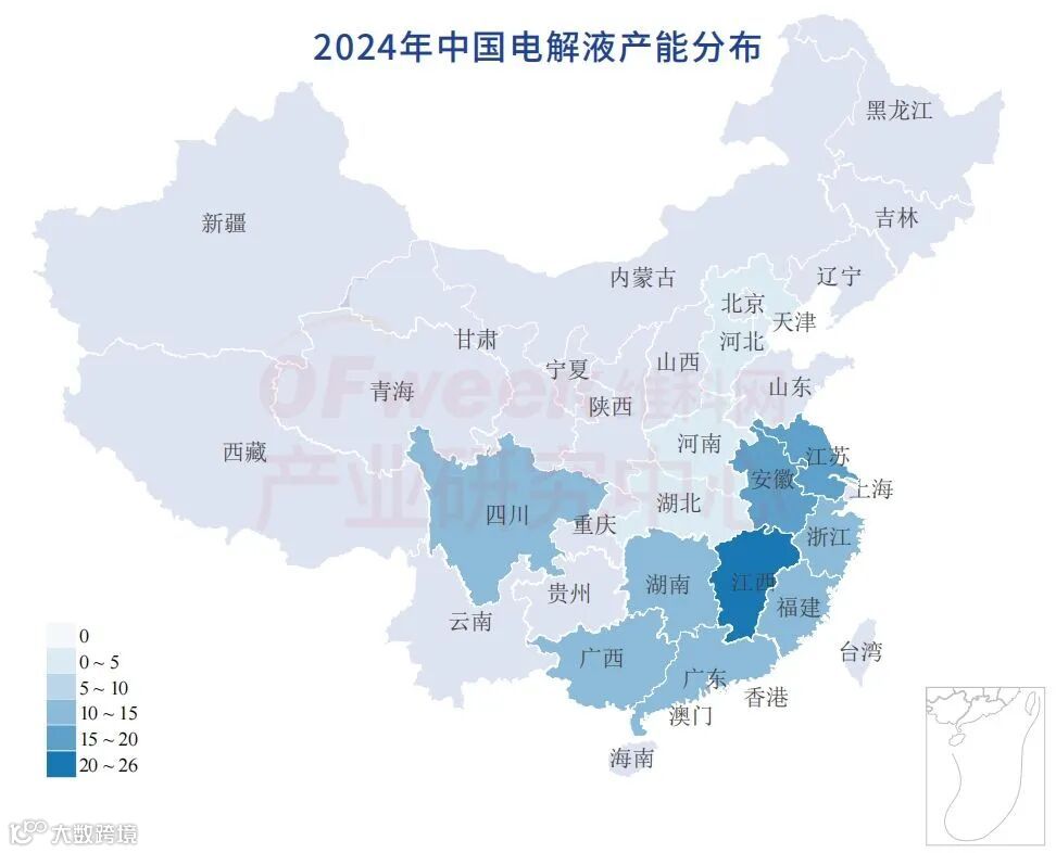 龙头厂商电解液产能合计达到133.5万吨,天赐材料、法恩莱特和新宙邦产能领先,其中天赐材料产能规模优势明显。电解液现有产能分布相对均匀,安徽、福建、广东、广西、湖南、江苏、江西、四川和浙江等省份产能规模均超过10万吨。