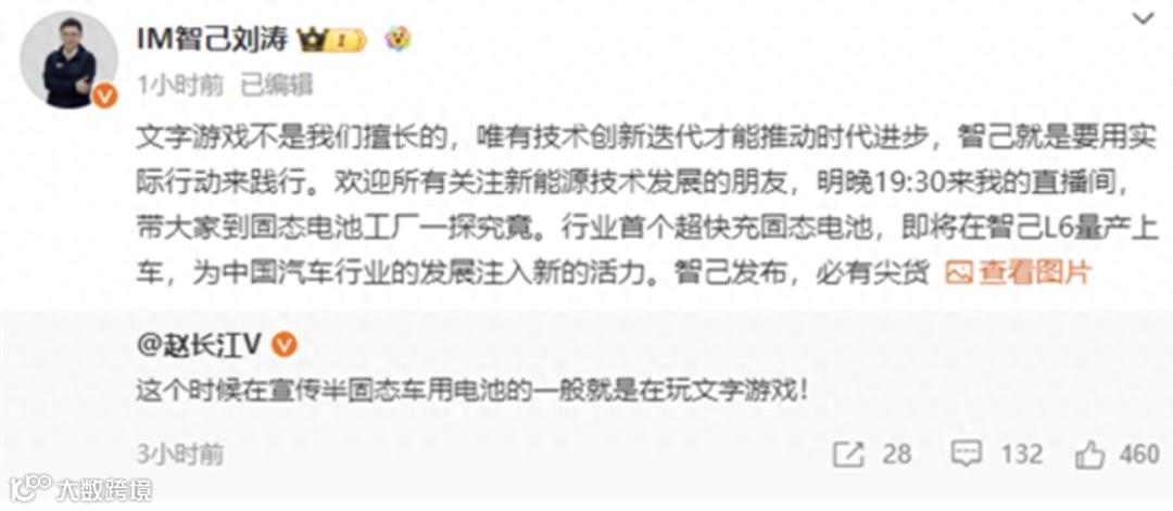 智己L6搭载固态电池引起市场广泛关注。连比亚迪旗下腾势汽车总经理兼首席共创官赵长江也在社交平台公开发声。赵长江称,“这个时候在宣传半固态车用电池的一般就是在玩文字游戏!”