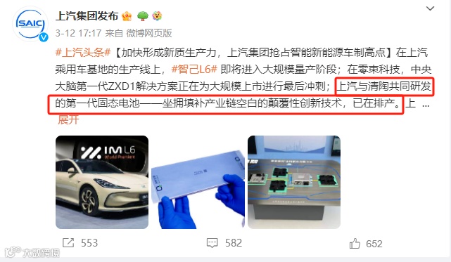 维科网锂电注意到,3月12日,在上汽集团的官方微博上,已透露上汽与清陶共同研发的第一代固态电池已在排产。