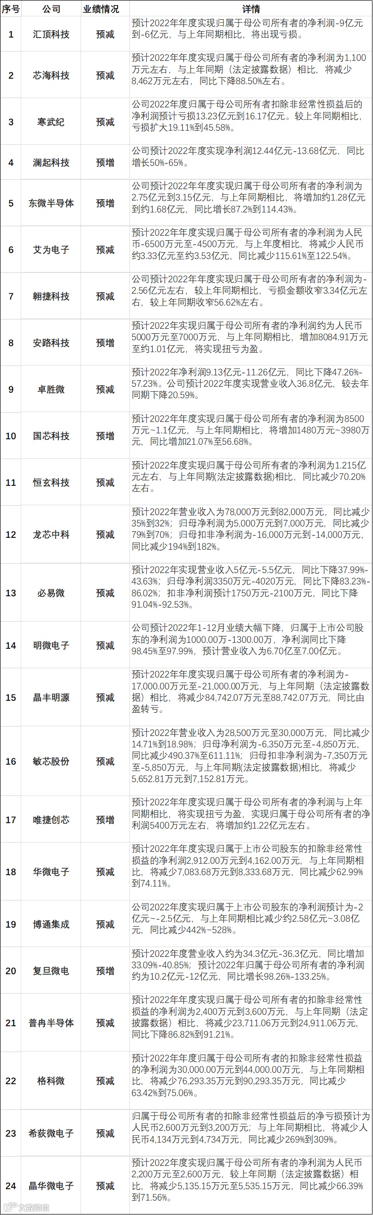 近日,国内各大半导体企业纷纷披露了2022年业绩或业绩预告。据不完全统计,国内各大半导体企业发布的业绩预告增减不一,以本文统计的24家IC设计企业公布的业绩情况来看,6家预增,18家预减,受多重因素影响,大部分企业业绩表现不太理想。