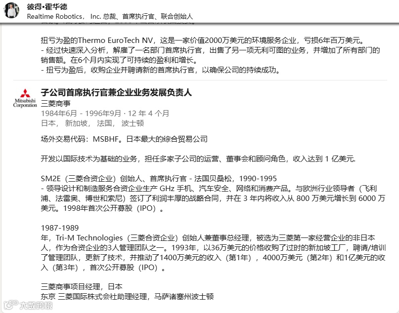 而公司CEO彼得·霍华德(Peter Howard)曾在三菱有长达12年的工作经历,曾担任三菱商事项目经理、Tri-M Technologies创始人兼董事总经理、SM2E创始人兼首席执行官,与三菱渊源颇深。