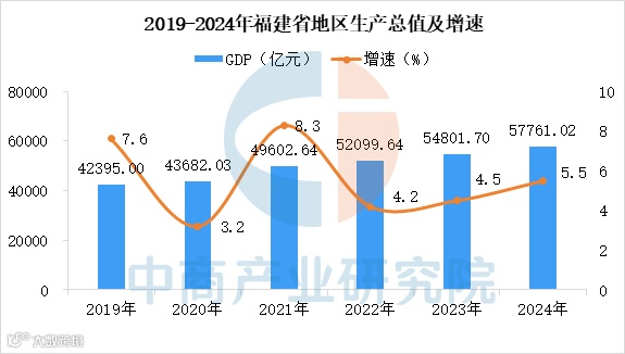 从经济发展情况来看,福建省2024年全年实现地区生产总值57761.02亿元,比上年增长5.5%。其中,第一产业增加值3287.67亿元,增长3.4%;第二产业增加值24713.16亿元,增长5.8%;第三产业增加值29760.19亿元,增长5.5%。第一产业增加值占地区生产总值的比重为5.7%,第二产业增加值比重为42.8%,第三产业增加值比重为51.5%。全年人均地区生产总值137920元,比上年增长5.5%。