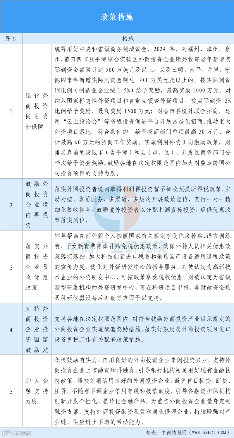 福建省委省政府、商务厅、工信厅、财政厅等部门印发的《福建省进一步优化外商投资环境加大吸引外商投资力度的若干措施》《福建省加快生物医药产业高质量发展实施方案》《关于促进基金服务专精特新中小企业高质量发展若干措施》《关于加强和改进青年科技人才工作的若干措施》《福建省促进人工智能产业发展十条措施》《关于进一步落实福建省加快生物医药产业高质量发展的实施方案若干措施》《全面推进“电动福建”建设的实施意见(2023-2025年)》《福建省首台(套)重大技术装备认定和扶持实施细则》,形成了覆盖产业发展的全面支持体系,为企业提供投资保障,推动经济高质量发展。