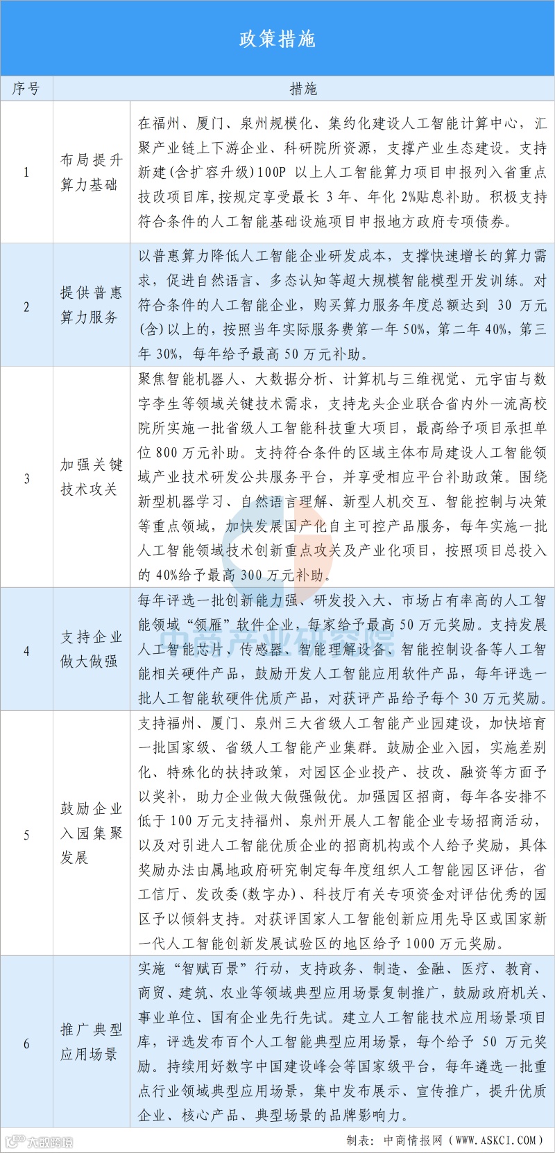鼓励各地结合地区实际及特色优势,抢抓发展机遇,布局人智能产业,出台政策措施,加强招商宣传,推动人工智能基础设施建设、关键技术研发、应用场景创新、人才资源集聚,构建良好产业发展环境。福州、厦门、泉州规模化建设AI计算中心,100P以上算力项目纳入省重点技改库,享受最长3年、年化2%贴息补助。普惠算力服务,企业购买算力年度超30万元,按50%、40%、30%分三年给予最高50万元补贴。