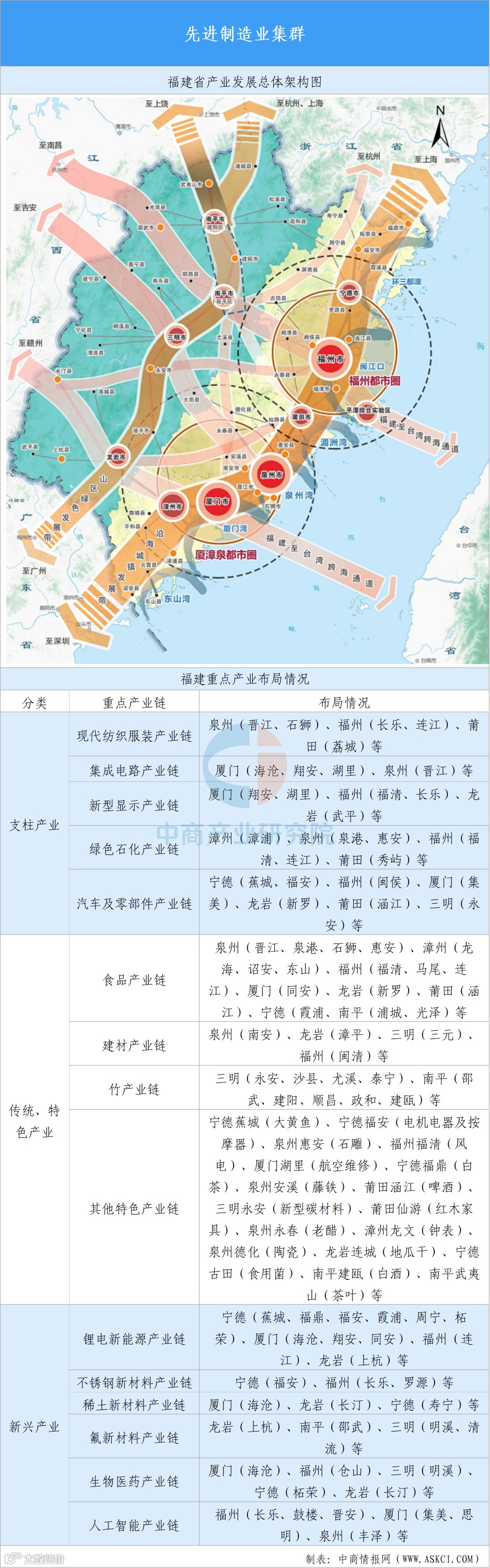福建省构建以“两极两带三轴六湾区”为主体的发展格局,有效支撑粤闽浙沿海城市群发展壮大,强化福州都市圈、厦漳泉都市圈两大极核,打造沿海城镇发展带,培育山区绿色发展带,重点拓展沿海至内陆的三条发展轴,推进环三都澳、闽江口、湄洲湾、泉州湾、厦门湾、东山湾六湾区建设。福建省发布《福建省人民政府办公厅关于推进县域重点产业链高质量发展的意见》,以县域产业链为支点,撬动全省产业体系向“高端化、集群化、绿色化”跃迁。