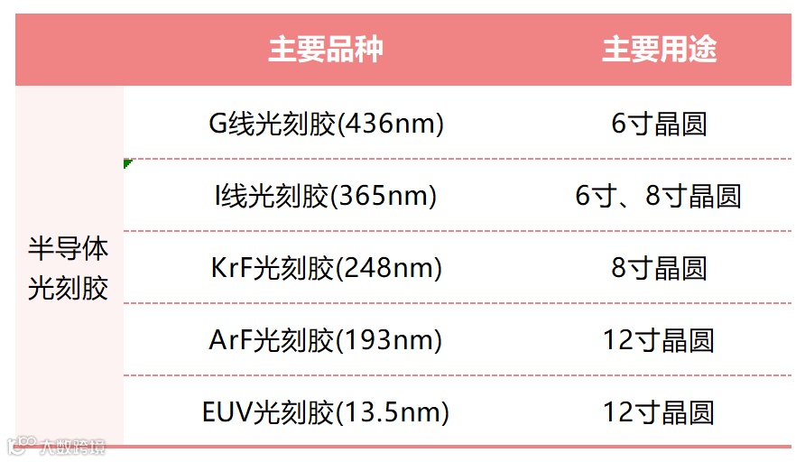 3. KrF光刻胶:适用于波长为248nm的KrF光源。KrF光刻胶属于深紫外光刻胶,适用于制程工艺在350mm以下的半导体应用。在现阶段,KrF光刻胶主要用于8寸晶圆片的制程。