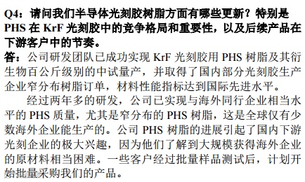早在今年6月,八亿时空近期在接受调研时便表示,公司研发团队已成功实现KrF光刻胶用PHS树脂50公斤级别的量产,最近又取得了国内某核心光刻胶生产企业100kg级别窄分布(PDI<1.2)树脂订单,材料性能指标达到国际先进水平,能满足国内光刻胶客户的需求,部分解决了国内光刻胶核心材料的卡脖子问题,打破了国际垄断。