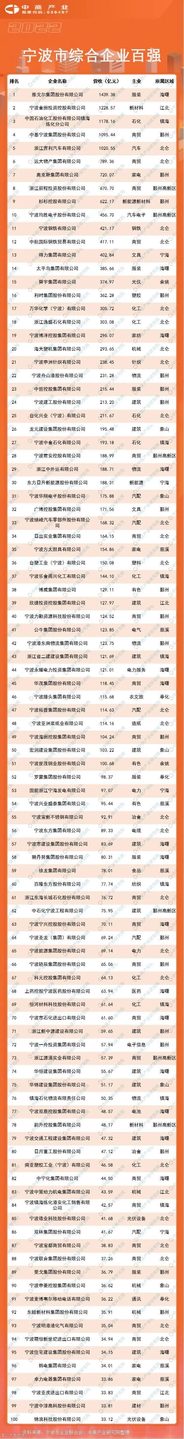 市工业经济联合会共同发布了2022宁波市综合企业百强榜单。榜单显示,宁波市综合企业百强营业收入20368.96亿元,入围门槛达到33.12亿元。