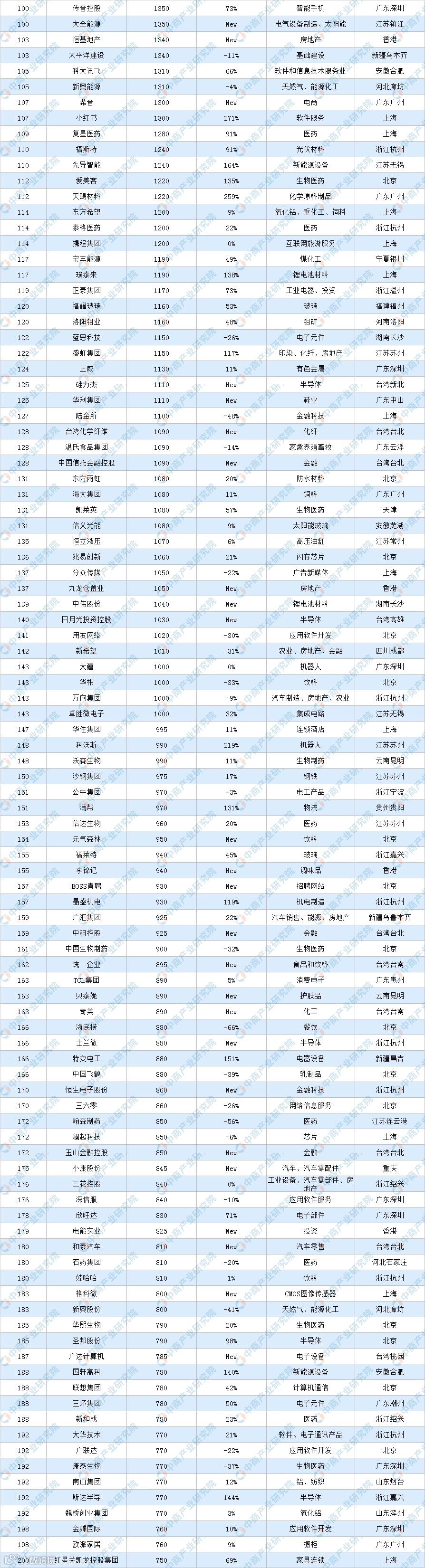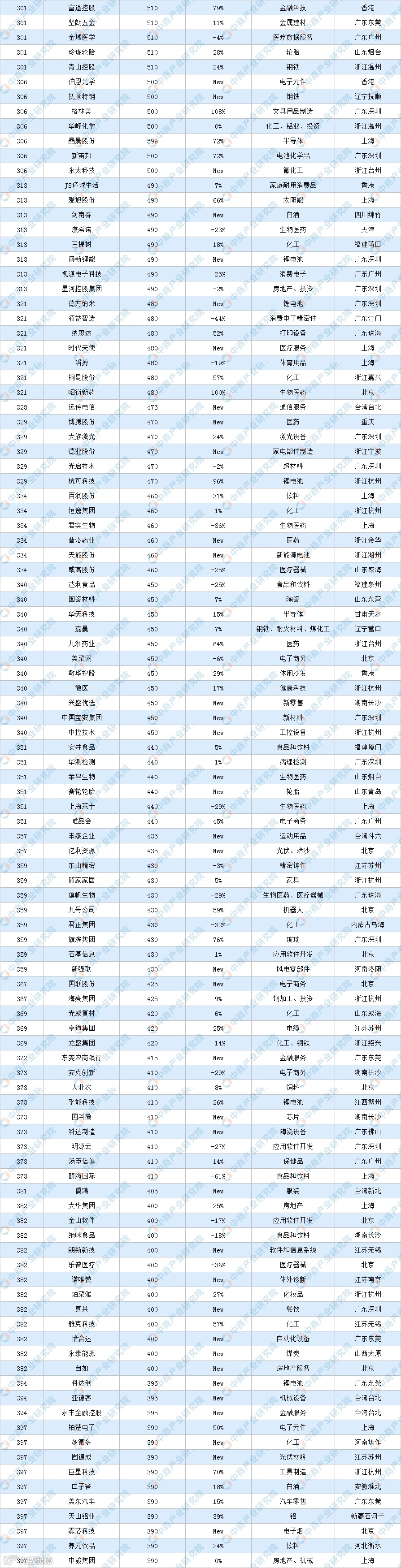 能源行业快速上升,成为500强企业数量第二多的行业,化工也从第六升至第三名,而医疗健康仍然是500强企业最多的行业。从总价值占比来看,传媒和娱乐、零售、医疗健康和半导体行业的总价值占全榜单的比例最高。