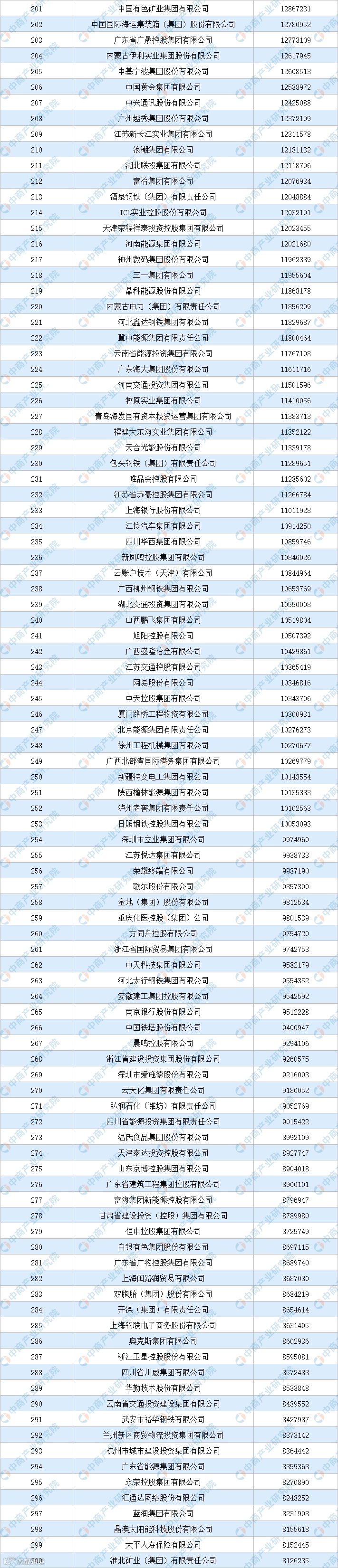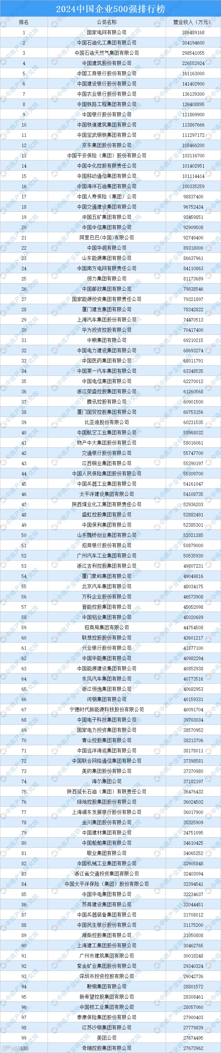 从上榜企业排名来看,国家电网有限公司以38648.92亿元营业收入位居榜首,中国石油化工集团有限公司、中国石油天然气集团有限公司排名第二和第三,营业收入分别为30419.46亿元、29854.11亿元。中国建筑股份有限公司、中国工商银行股份有限公司、中国建设银行股份有限公司、中国农业银行股份有限公司、中国铁路工程集团有限公司、中国银行股份有限公司、中国铁道建筑集团有限公司进入前十,依次排名第4-10名。