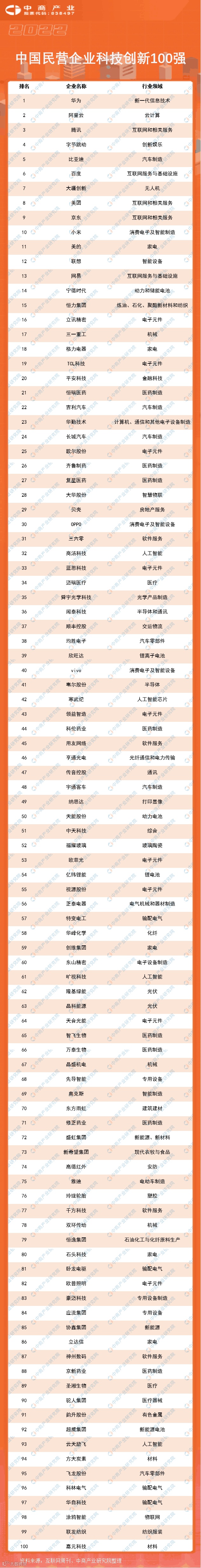 榜单显示,华为、阿里云、腾讯、字节跳动、比亚迪、百度、大疆创新、美团、京东、小米进入榜单前十。