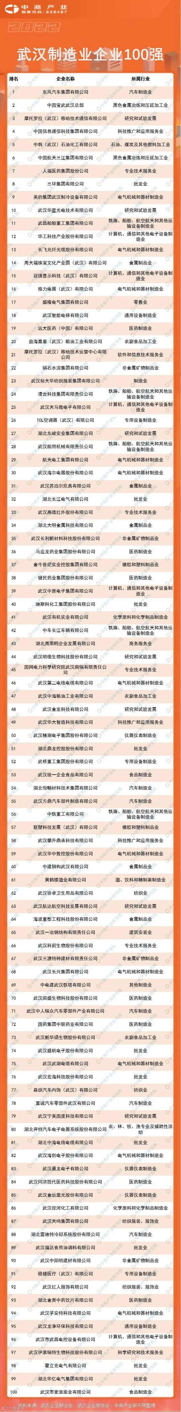 2022武汉制造业企业100强榜单