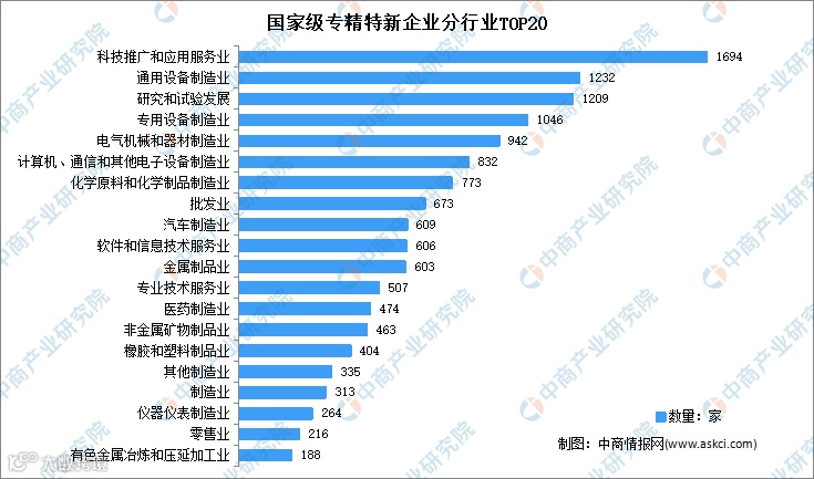 从行业来看,科技推广和应用服务业上榜企业最多,达1694家;其次是通用设备制造业,上榜企业为1232家;再次是研究和试验发展,上榜企业为1209家;专用设备制造业,上榜企业为1046家。前四行业企业均超1000家。前二十行业上榜企业共计13383家,占总上榜企业数量的87.2%。