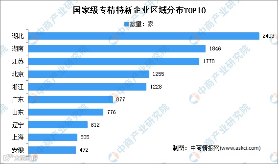 截至目前,国家级专精特新企业共计15351家,从省市来看,湖北省上榜企业数量位居第一,共计2403家;其次是湖南省,达1846家;再次是江苏省1778家。前十省市共计上榜11772家,占总上榜企业数量的76.7%。前十省市分别为:湖北、湖南、江苏、北京、浙江、广东、山东、辽宁、上海、安徽。