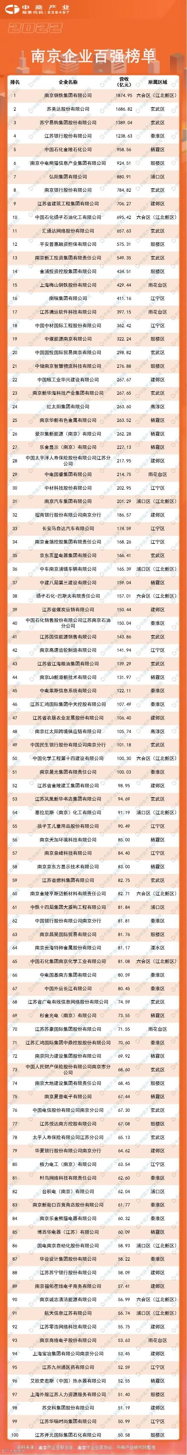 近日,南京市企业联合会、南京市企业家协会联合发布了“2022年南京企业百强榜单”。榜单显示,上榜100强企业营业收入为24401.29亿元,同比增长12.61%;入围门槛为50.58亿元,同比上年提高了12.07亿元。