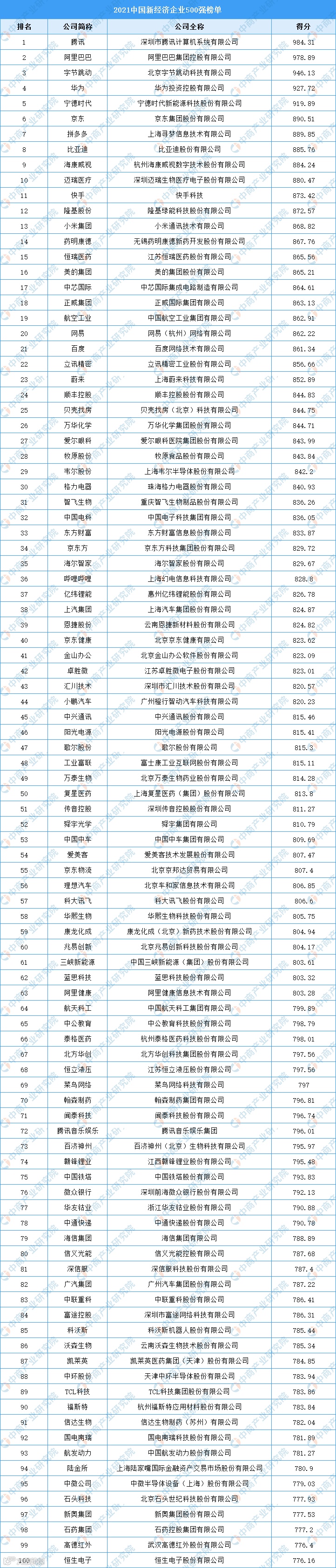 2022年7月23日,中国企业评价协会发布“2021中国新经济企业500强”榜单。榜单显示,前五企业得分均超过900,腾讯以984.31的得分位居第一;阿里巴巴位居第二,得分为978.89;字节跳动位居第三,得分为946.13。从行业分类上看,先进制造业企业314家,比上年增加了58家,占比增加一成。