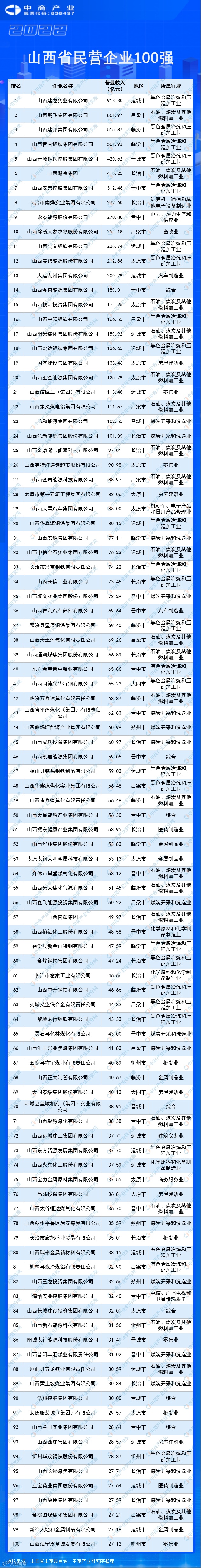 山西建龙实业有限公司、山西鹏飞集团有限公司、山西建邦集团有限公司、山西晋南钢铁集团有限公司、山西晋城钢铁控股集团有限公司进入榜单前五。