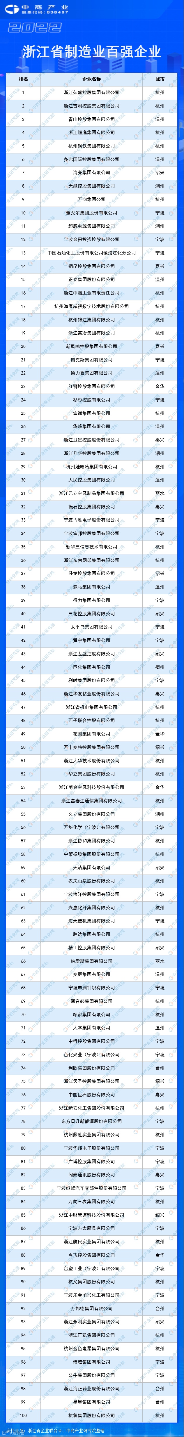 “2022浙江省制造业百强企业”前十企业分别为浙江荣盛控股集团有限公司、浙江吉利控股集团有限公司、青山控股集团有限公司、浙江恒逸集团有限公司、杭州钢铁集团有限公司、多弗国际控股集团有限公司、海亮集团有限公司、天能控股集团有限公司、万向集团公司、雅戈尔集团股份有限公司。