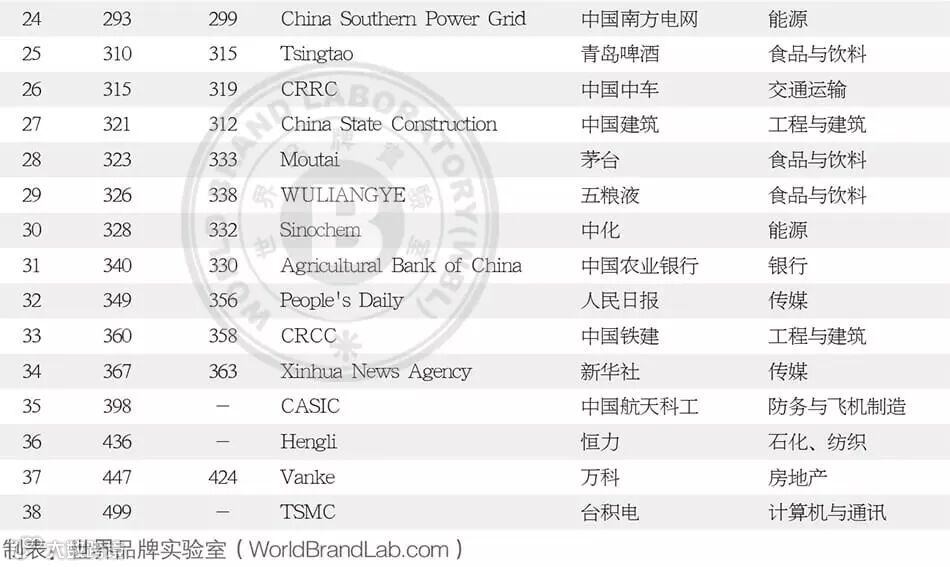 上榜的知名品牌还有:联想(第102名)、百度(第230名)、中国联通(第236名)、中国电信(第245名)、青岛啤酒(第310名)、茅台(第323名)、五粮液(第326名)、人民日报(第349名)、万科(第447名)。
