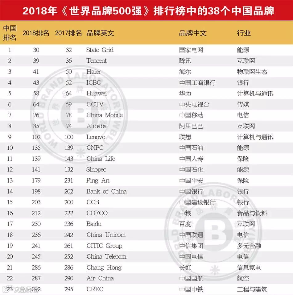 由世界品牌实验室独家编制的2018年度(第十五届)《世界品牌500强》排行榜于12月18日在美国纽约揭晓。中国入选的品牌只有38个,与经济第二大国的地位并不匹配。其中,国家电网排名第一,腾讯和海尔位列第二和第三。此外,还有中国工商银行、华为、中央电视台、中国移动、阿里巴巴挤进全榜单TOP100。