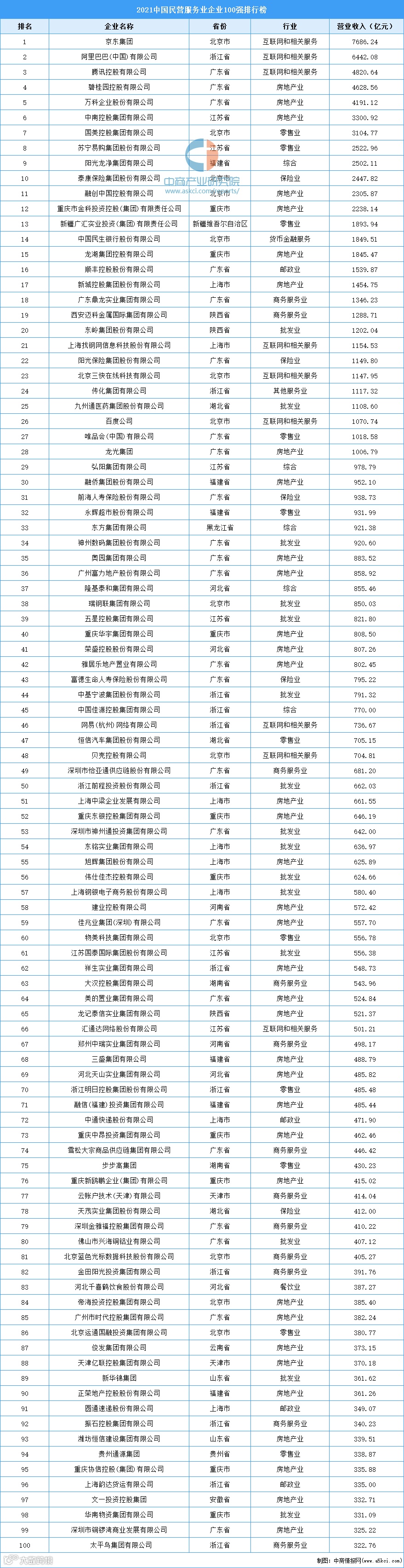 9月25日,全国工商联在湖南省长沙市发布“2021中国民营服务业企业100强排行榜”。榜单显示,前十企业营业收入共计41647.21亿元,占100强营业收入的38.4%。前十企业分别为:京东集团、阿里巴巴(中国)有限公司、腾讯控股有限公司、碧桂园控股有限公司、万科企业股份有限公司、中南控股集团有限公司、国美控股集团有限公司、苏宁易购集团股份有限公司、阳光龙净集团有限公司、泰康保险集团股份有限公司。其中,京东集团、阿里巴巴(中国)有限公司、腾讯控股有限公司位居前三强,营业收入分别为7686.24亿元、6442.08亿元、4820.64亿元,分别占100强营业收入的7.1%、5.9%、4.5%。
