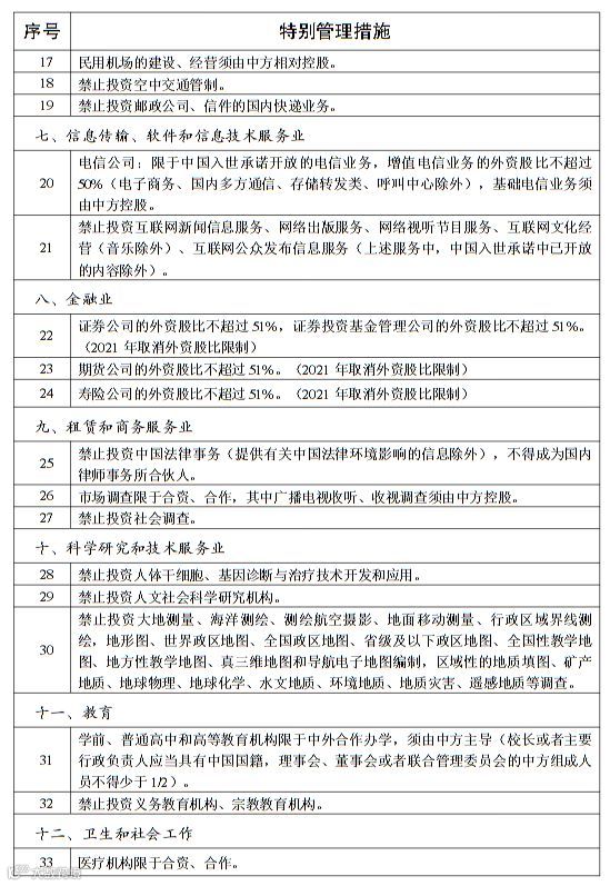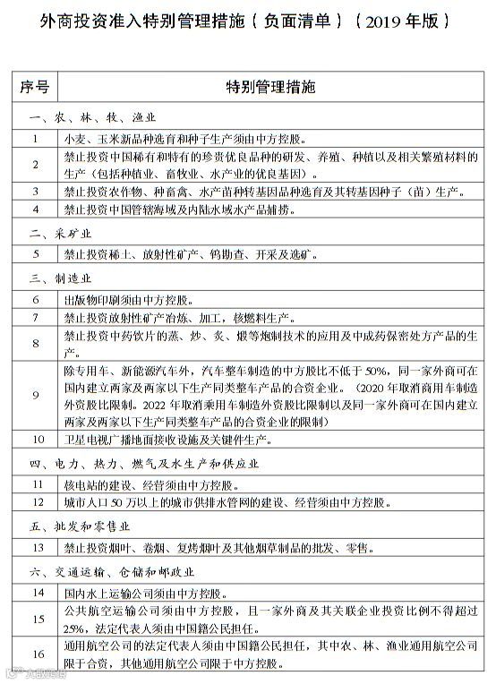 一、《外商投资准入特别管理措施(负面清单)》(以下简称《外商投资准入负面清单》)统一列出股权要求、高管要求等外商投资准入方面的特别管理措施。《外商投资准入负面清单》之外的领域,按照内外资一致原则实施管理。