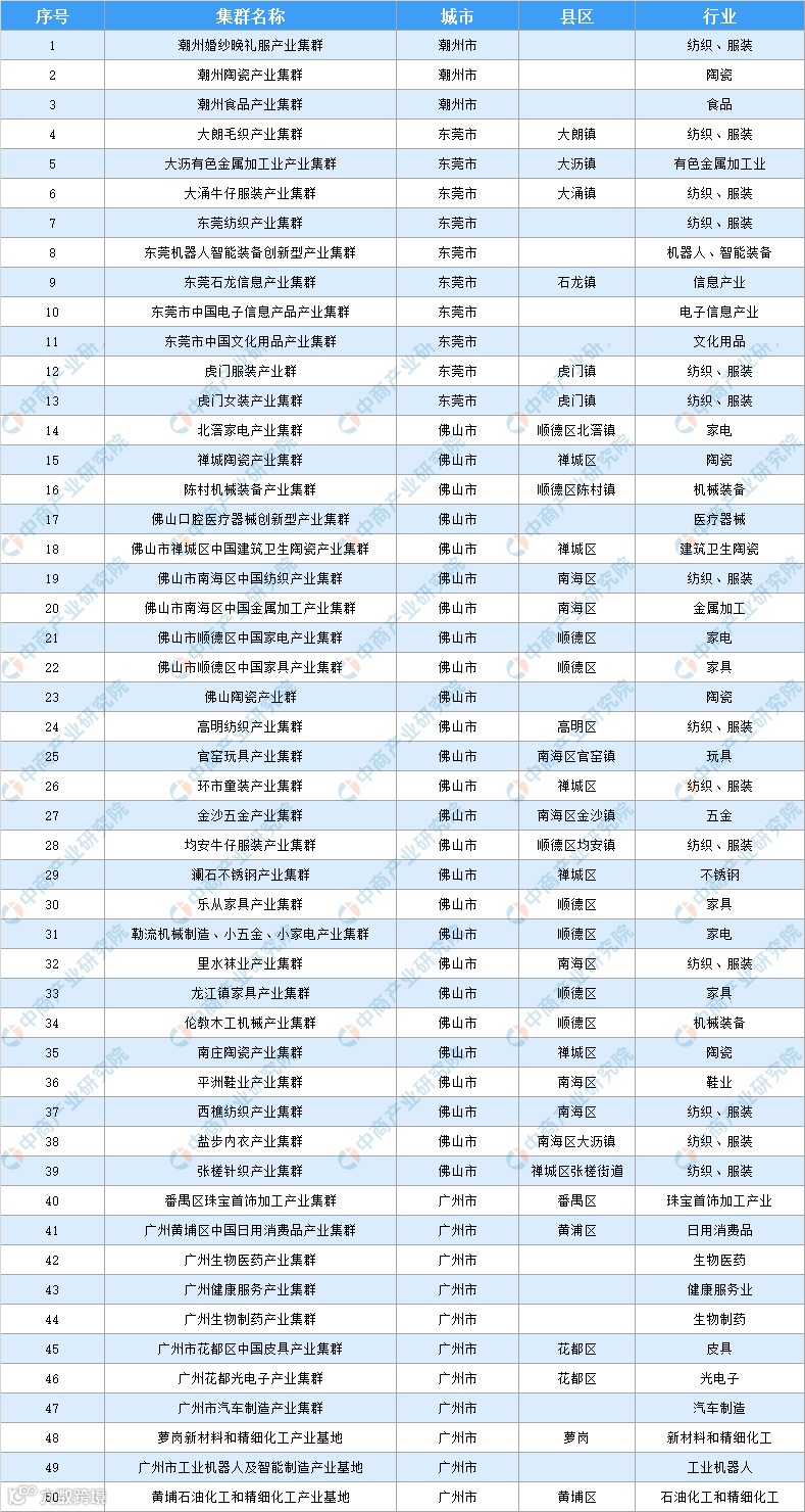 2020年广东省107个产业集群汇总表