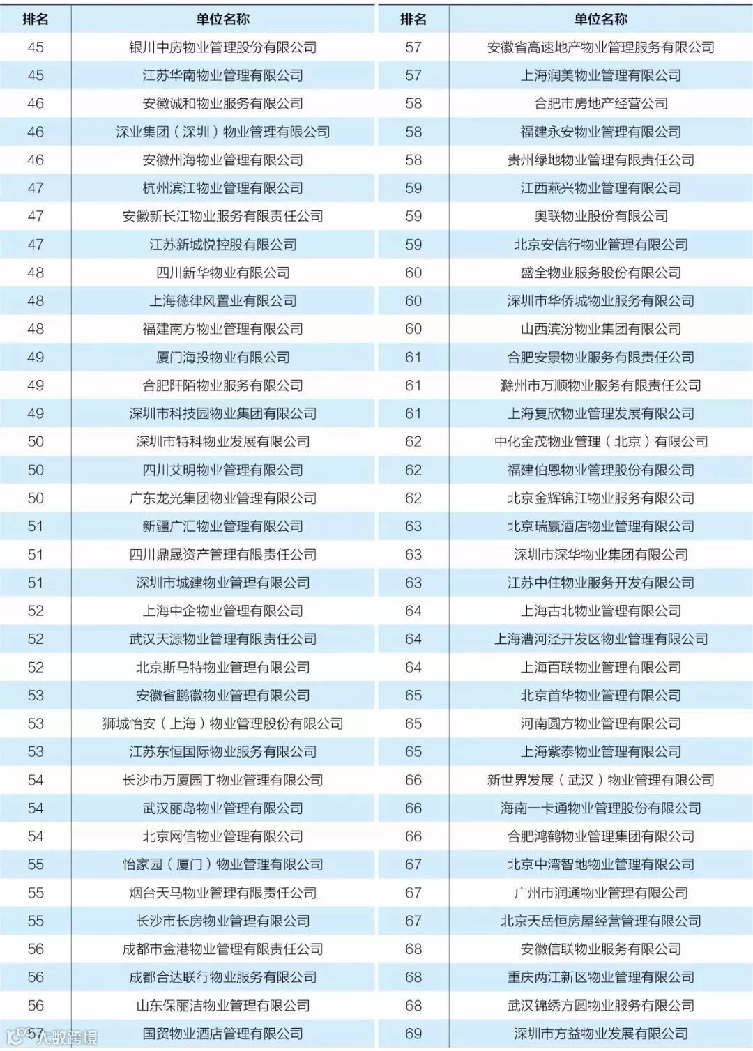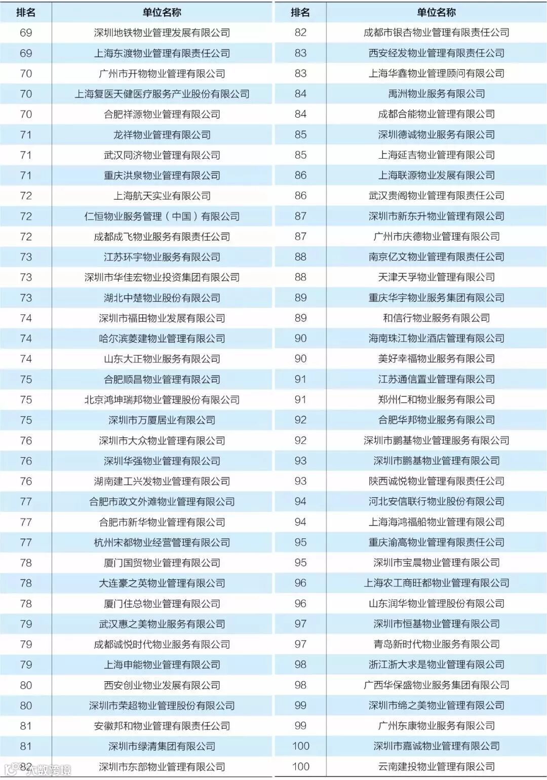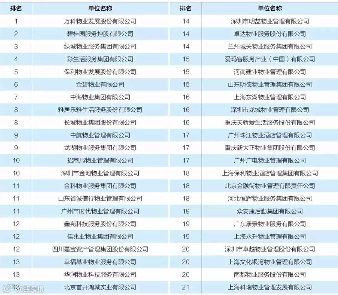 近日,中国物业管理协会发布了《2018年全国物业管理行业发展报告》,报告公布的全国物业服务企业综合实力TOP100,其中十强分别为:万科物业、碧桂园物业、绿城物业、彩生活、保利物业、金碧物业、中海物业、雅居乐雅、长城物业、中航物业、龙湖物业、招商局物业、深圳市金地物业。