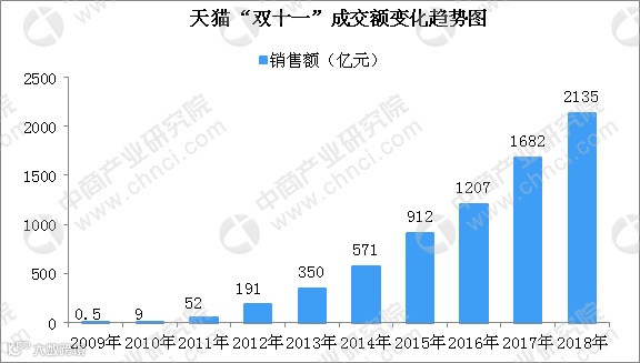 2018年这场全民购物狂欢正式收官。据数据显示:11月11日24时,随着最终数字的定格,2018年天猫双11全球狂欢节全天成交额突破2000亿元(人民币,下同)大关,达到2135亿元,相比去年增长约27%。相比于2009年的0.5亿元成交额,增长超过4200倍。同时,今年天猫双11全天物流订单量达到10.42亿,再创新纪录,进入1天10亿包裹的时代。